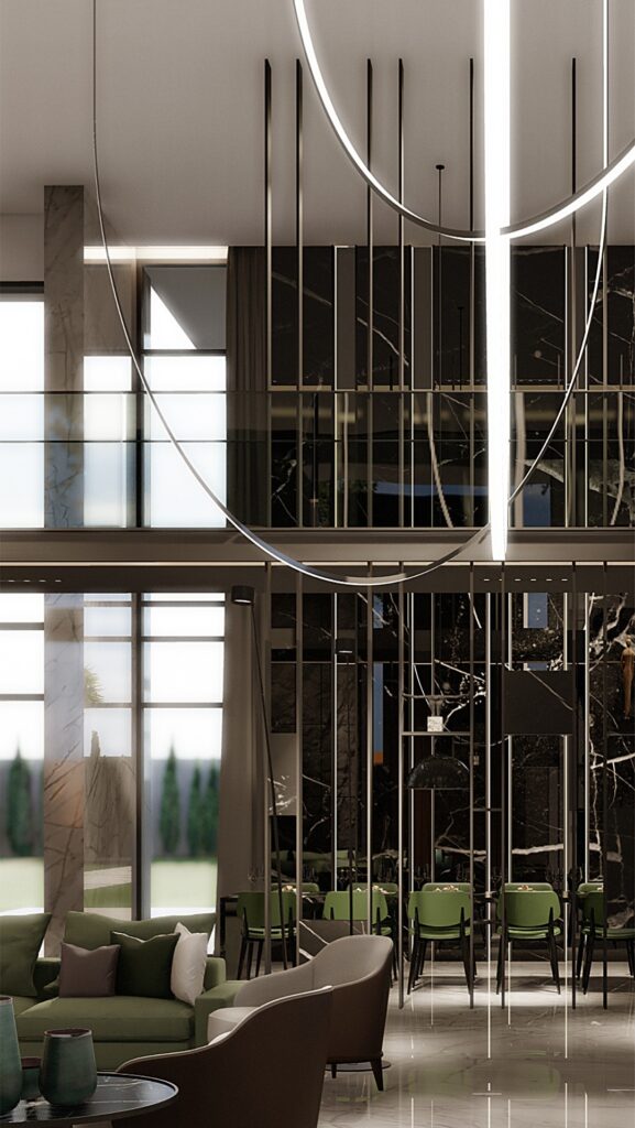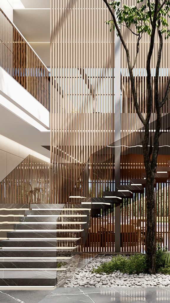 A bold symphony of modern minimalism and sculptural elegance, this private residence by Maroon Breidy and Spirit Design Group redefines luxury living. Framed with floating rooflines, floor-to-ceiling glass, and precision-cut stone, the home blurs the line between architecture and art. Inside, a striking double-height atrium—anchored by a central tree and floating stairs—sets the tone for a space that’s both organic and refined. The interiors flow seamlessly with curated materials, bespoke furniture, and immersive lighting that elevate each zone into a gallery of contemporary design.