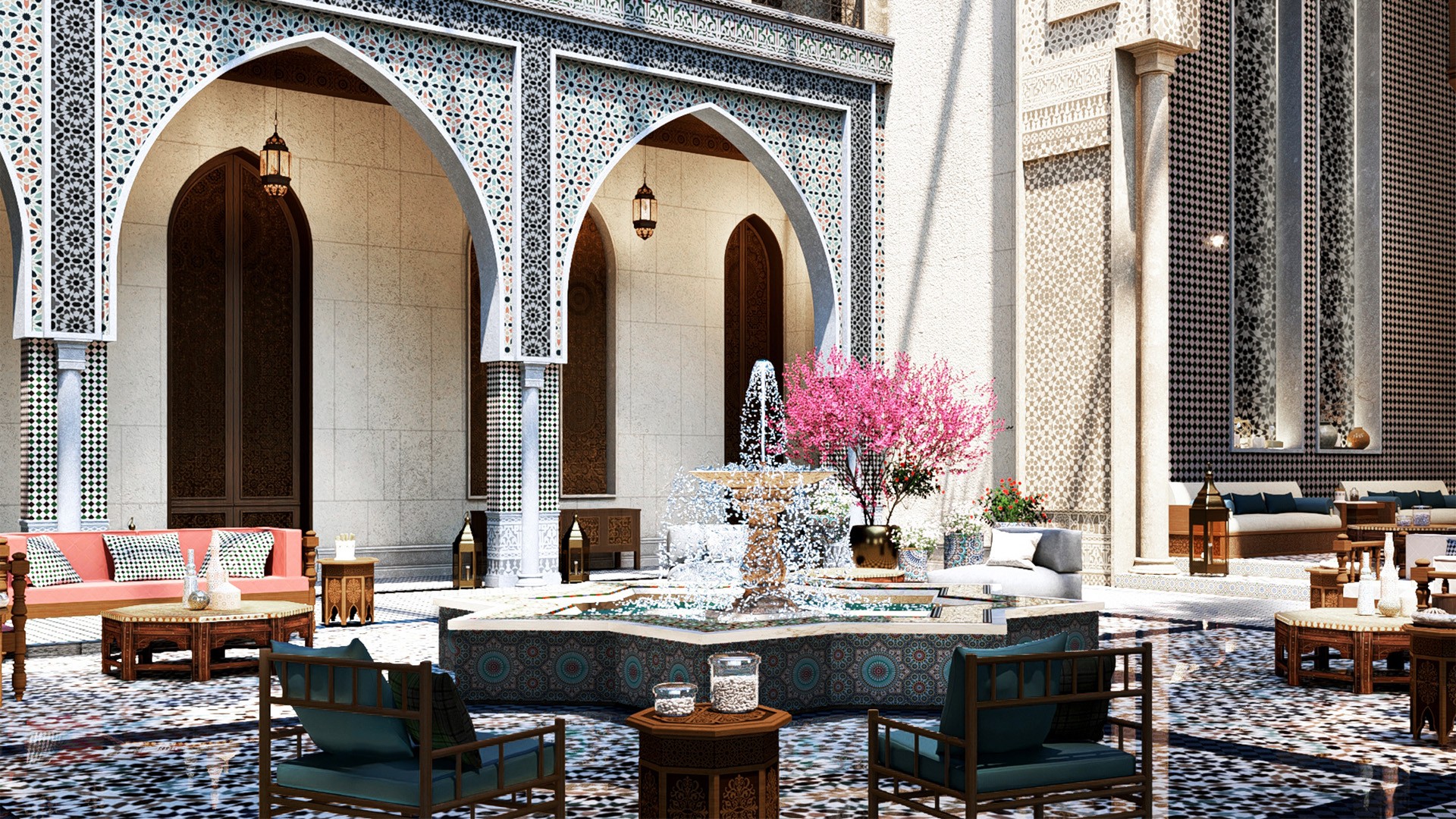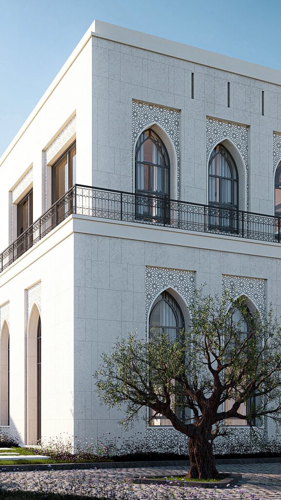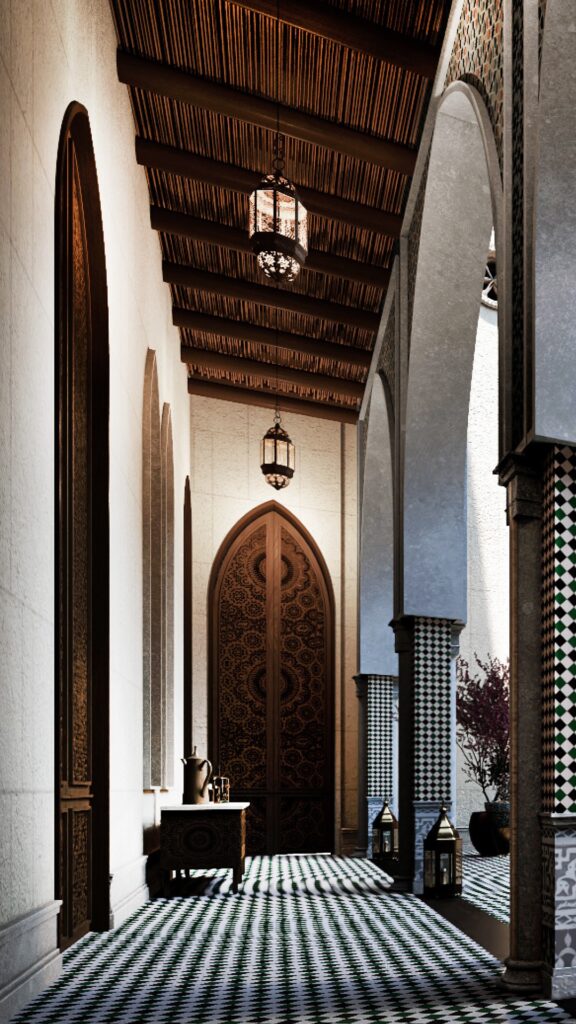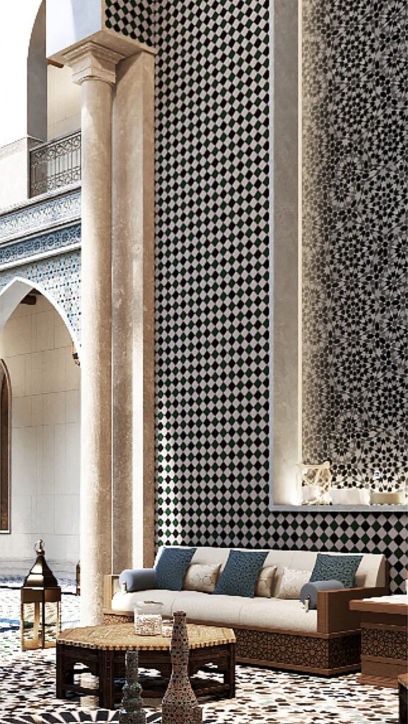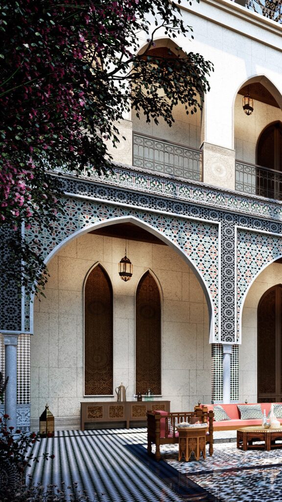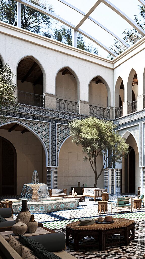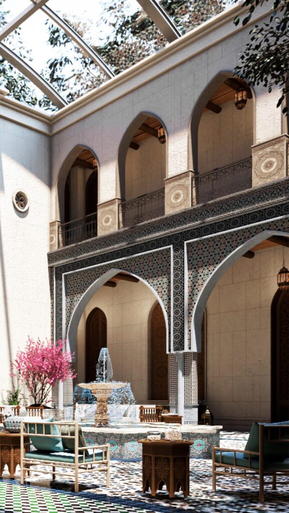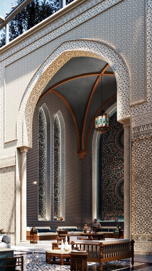 Where tradition meets contemporary brilliance, this palatial residence by Spirit Design Group by Maroon Breidy is a bold reinterpretation of Andalusian-Moorish architecture. The commanding arches, intricate mashrabiya-inspired screens, and symphony of geometric tiles create a spatial rhythm that blends heritage with innovation. The central courtyard, crowned by a vaulted glass canopy, evokes an ethereal connection to the sky, allowing light to dance across the handcrafted mosaics and water features. It’s not just a space—it’s a living narrative etched in stone, wood, and light.
