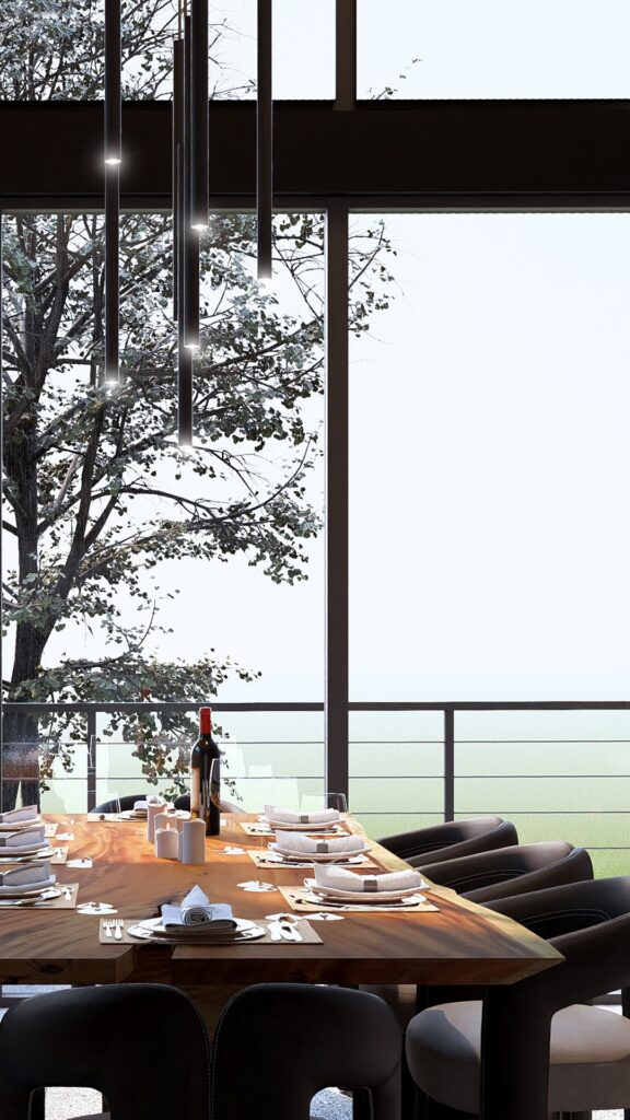 The design blurs boundaries between the interior and exterior. Expansive windows, stone walls, and wooden textures connect the home to its environment, ensuring a constant flow of light, views, and atmosphere. Every corner celebrates harmony with nature while offering comfort and privacy.